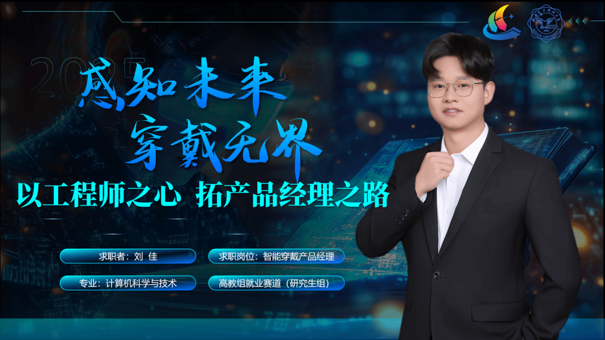在此次大赛中,刘佳以“感知未来 穿戴无界”为主题,从职业选择、行业认知、岗位胜任力、职业规划四个方面进行综合展示,深入剖析了智能穿戴设备在医疗健康领域的革新应用与行业人才需求。在综合面试环节,刘佳沉着冷静、从容应对,充分展现了计科学子专业扎实、严谨务实的精神风貌。赛后刘佳表示,本次大赛深化了对职业发展的理解,特别是通过数据收集、自我画像、行业访谈完成的岗位胜任力分析,为未来职业发展锚定了方向。
